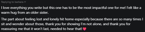 I screenshot every comment that makes me feel encouraged and happy in that moment. I keep them as a small archive of courage, something to return to when I question myself again.