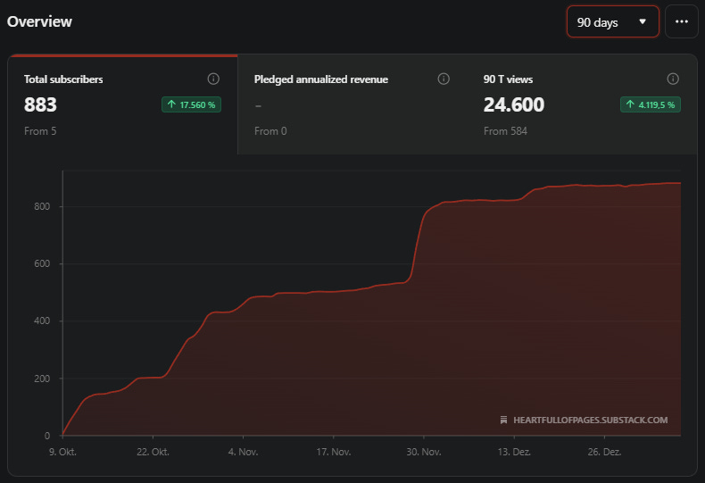 I am ending December with 883 subscribers. Not quite the number I imagined, but I am grateful for every single one. Especially because I never followed the sub-for-sub route. The people who are here chose to be here. That feeling is worth more than any round number!